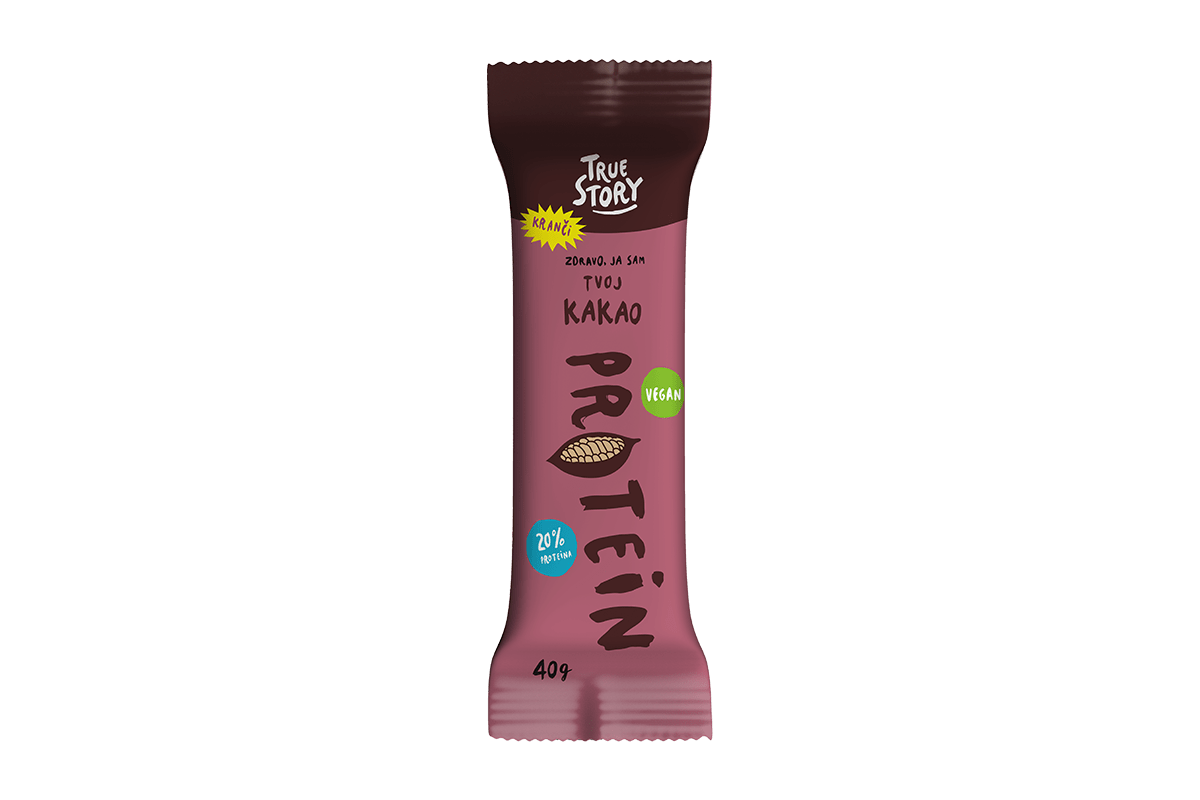 Zdravo, ja sam tvoj skroz novi Kakao protein, sa 20% proteina! Kranči sam, nepredvidiv i inovativan, a sačinjavaju me jedino sušena urma, sojin proteinski koncentrat, kakao masa i badem! Stvoren sam za svakoga ko želi da doda malo proteina u svoju svakodnevnu rutinu, ali bez dodatog šećera ili aditiva!