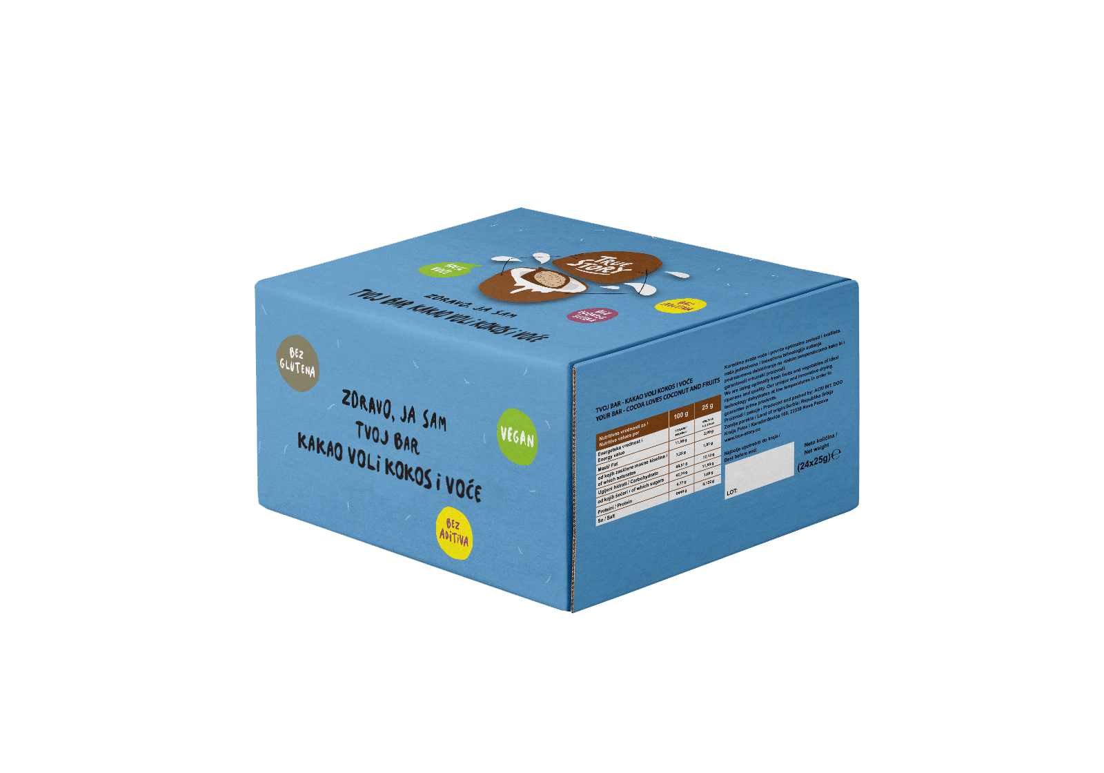 Zdravo, ja sam novi Tvoj bar – Kakao voli kokos i voće! 100% sam prirodan i sastojim se od samo 5 sastojaka: urma, kokos, kakao masa, lešnik i sušena jabuka. I tu sam za tebe kad god ti treba malo tropskog ukusa.