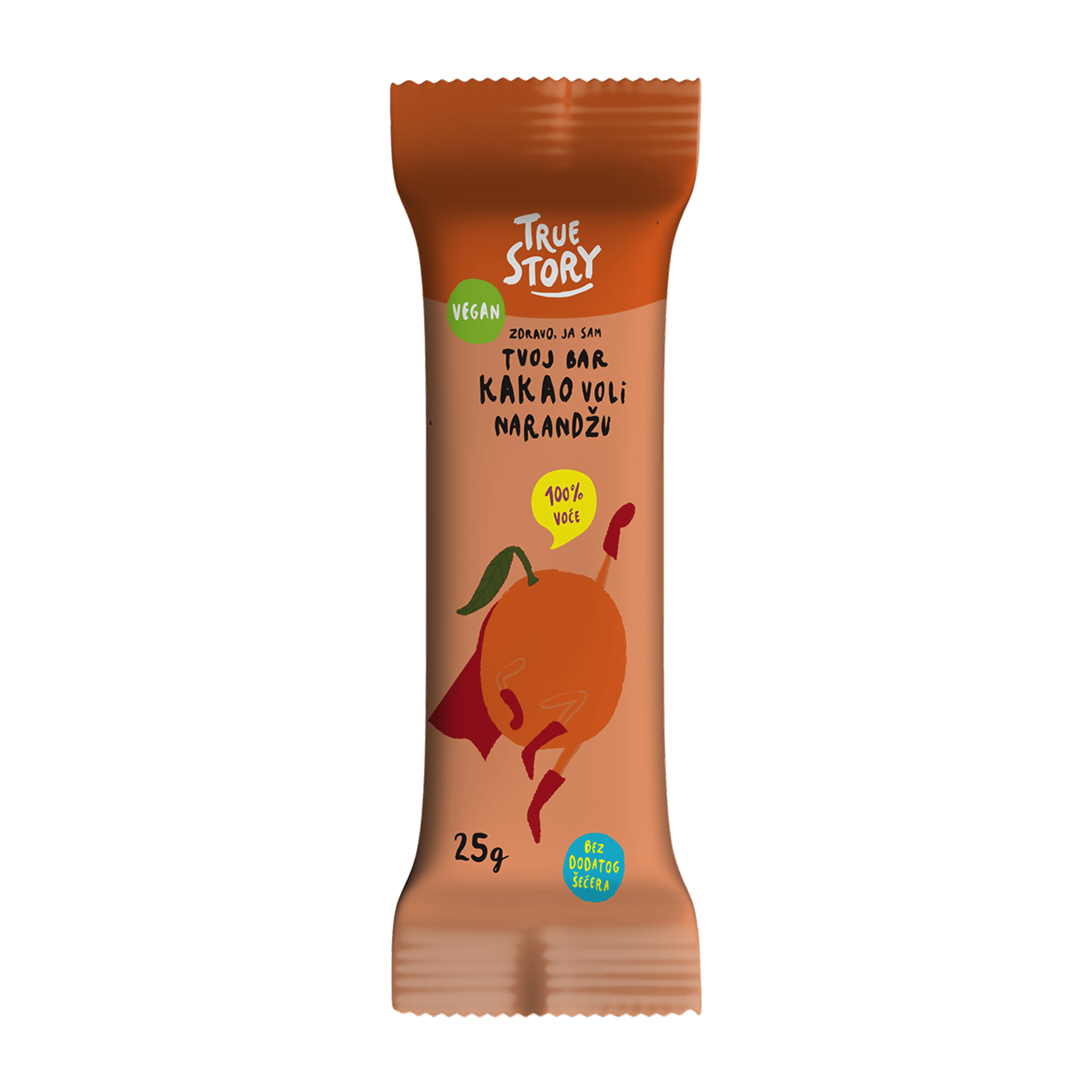 Zdravo, ja sam novi Tvoj bar Kakao voli narandžu! Sačinjen sam od 100% voća i povrća, sa citrusnim ukusom koji ćeš obožavati! Sačinjavaju me sušena urma, sušena jabuka, sušena narandža i kakao masa!